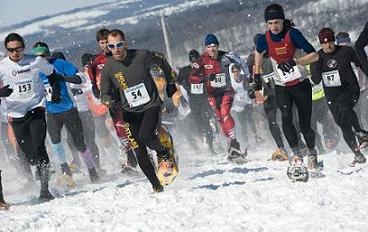 The 2010 USSSA PowerSox National Championships knocked the socks off the country’s best snowshoers on a wickedly wavy way worthy of this historic Tenth Anniversa-race. The signature feature, a finish line climb recalling Olympic Ski-Jump hills, gave novel meaning to Host Chary Griffith’s pledge to “fully tour” all possible elevation changes. Extended Special Coverage of this record gathering of all things snowshoe racing is presented by Snowshoe Magazine in Feature Articles, starting right now with The Race: Senior Men’s Championship Race.