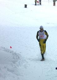 Dewey Peacock, Bozeman, and Tom Borschel, Idaho Falls, ID, (see picture) continued their annual two-man race for the win here but Dewey pulled off the course ill, and Tom took the men’s and overall gold with a 30:37. Gary characterized Tom’s speed, as he blew by the RD who had jumped into the back of the fray and raced, as “powerful and really moving. His flashy yellow Atlas racing unitard passed all of the 3 km racers who had started 15 minutes earlier.”
