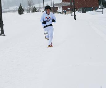 Brent gladly took the challenge as did the other nine runners in the 10K race.  “Mountain Man” and legendary burro racer Kevin Mastin (Silverthorne, CO) was third in the men’s race wearing Redfeathers.  Lisa Mills (Aurora, CO) won the women’s race in a time of 1:16, followed by Jill Heil (Summit Cove, CO) in Tubbs, and Susan Mocatta (Breckenridge, CO).  All of the top three women’s racers were unscathed by the winter weather and smiling after the race asking Loki if that was all he had to give them!