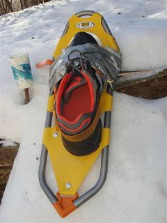 Broken bindings were not uncommon today as the cold and the harshness of the course beat ‘em up. Check out the photo of a duct tape repair on my snowshoes, a job done handsomely by the guys at Aid #1 . . . the same duct tape used earlier to tape Julie’s heel back together. Also note one of their famous chicken soup cups that survived the journey.