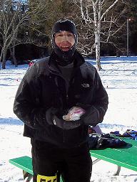 Jim McDonell, known as Mr. Braveheart, was standing nearby with his blue and white face paint (when is Dermatone going to make colors?), and I was listening to him apologize to a racer who asked in jest why he wasn’t wearing his typical singlet and shorts . . . . Jim showed him by zipping down that he had only a light jacket over his singlet. Remember, sports fans, it is negative nineteen Fahrenheit. I kinda slinked away, trying to blend in with the many others who shared my passion for Lots-O-Layers.