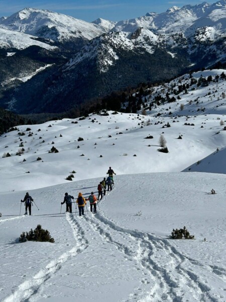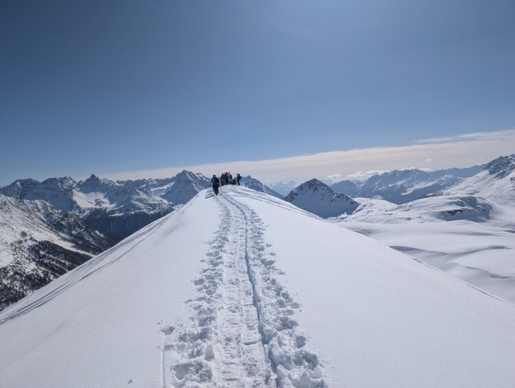 Our hike led us up to Motta Bianca (2,560 m) under ideal conditions. Along the way, we passed a group building an igloo before reaching the summit, where panoramic views stretched in every direction.