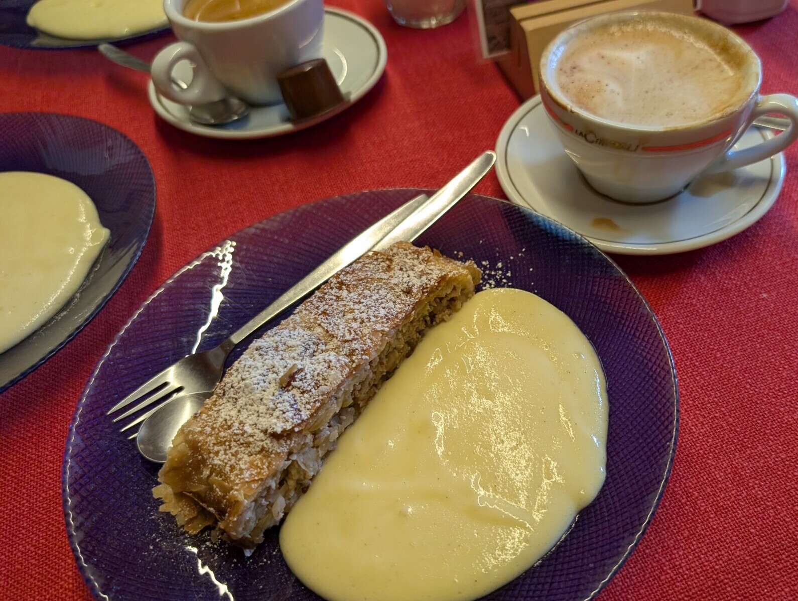 A daily ritual—coffee and cake, including standout apple strudel at Gasthaus Hirschen in Lü. Photo: Paul G. Schreier.